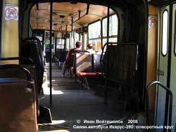 Автобус имеет 3-рядную планировку сидений: два ряда по правому борту, один ряд по левому. Напротив задней двери имеется накопительная площадка. Благодаря высокому расположению пола (на входах - три ступени) сам салон очень просторен: имеет широкие проходы между сиденьями и абсолютно ровный пол для стоящих пассажиров, лишь немного выступающие колесные ниши препятствуют удобной посадке на нескольких сиденьях по правому борту. Кроме накопительной площадки напротив задней двери (которую зачастую заставляют сиденьями), большой площадкой для стоящих пассажиров является поворотный круг в узле сочленения. Автобус имеет длину 16,5 метров, в отличие от принятых в Европе 18-ти. В Минске встречались 2-дверное исполнение (отсутствуют вторая и четвертая двери), 3-дверное исполнение (без четвертой двери) и традиционное четырехдверное. В других городах Беларуси "нестандартные" исполнения были еще более распространены. В Гомеле используется много двухдверных машин на пригородных маршрутах, а в Витебске - и на городских. С конца 1980-х годов автобусы начали оборудовать двустворчатыми дверьми поворотного типа. Сиденье водителя регулируется по высоте, длине, массе и наклону подушки и спинки. Посадка за рулем достаточно удобная, благодаря высокому расположению сиденья водителя и гнутому лобовому стеклу обеспечен прекрасный обзор. Этому же способствуют крупные наружные зеркала. Зеркало для обзора в салон также расположено удачно. К тому же, водительское сиденье расположено довольно высоко. В центре передней панели расположена панель приборов. Справа - клавиши открытия дверей, слева - остальные тумблеры управления различными системами автобуса. Отопление салона возложено на водяную систему охлаждения двигателя. В системе отопления применяются отдельные радиаторы-отопители Sirocco с вентиляторами для обогрева кабины, отдельно лобового стекла, пассажирского салона. Стоит отметить хорошую вентиляцию. Для вентиляции салона предусмотрены большие сдвижные форточки, а также пять аварийно-вентиляционных люков на крыше. Над водительской кабиной дополнительно установлен крышный вентилятор.